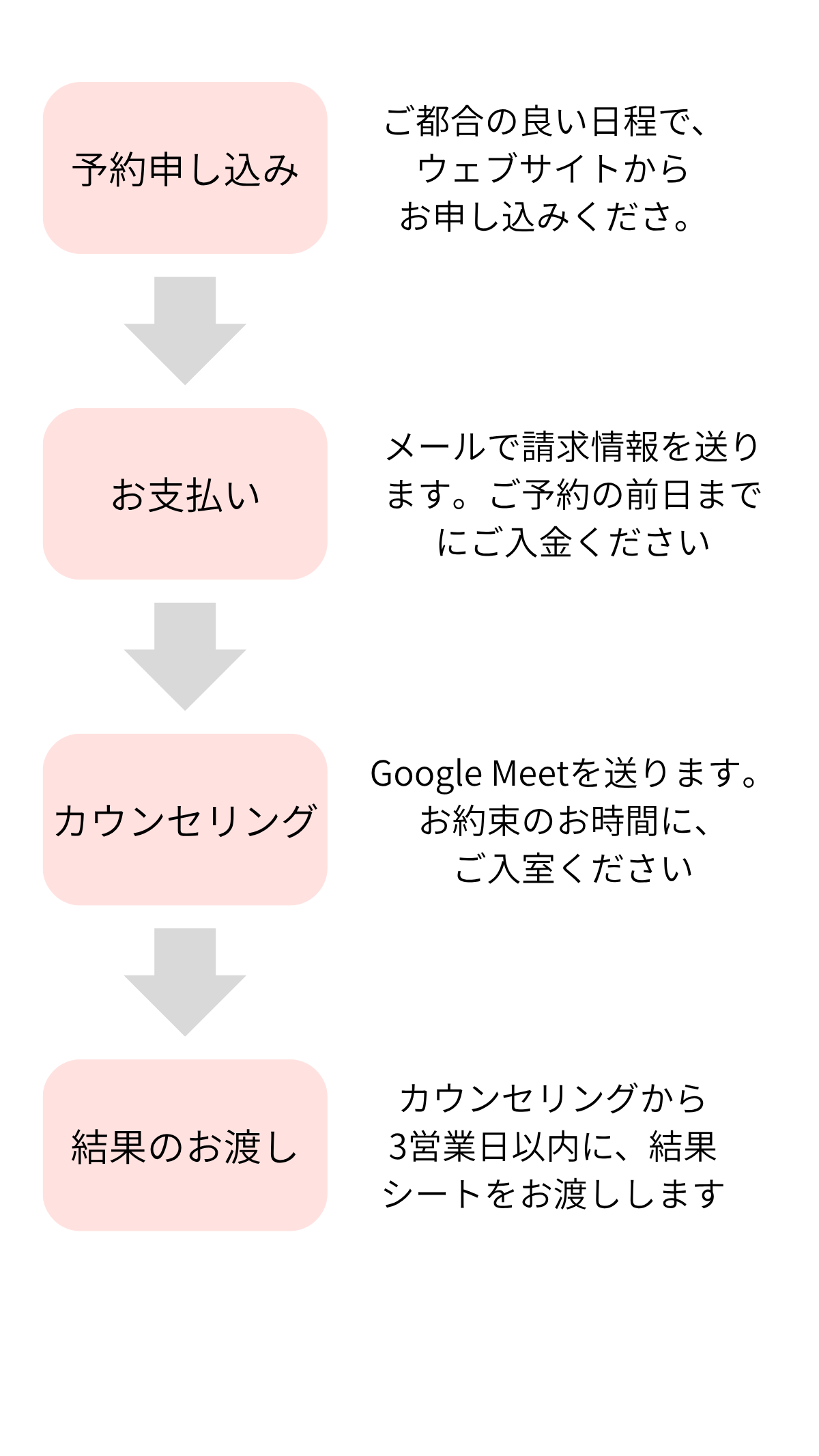ご予約完了後、当日使用するGoogle MeetのURLをお知らせいたします。